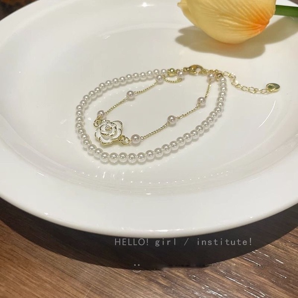 ✅ Elegant Bracelet – White pearls with gold chain & rose charm, symbol of purity & grace